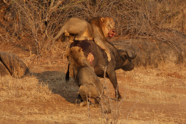 Dos leones intentan derribar a un búfalo en el Parque Nacional de Ruaha. El paisaje de Ruaha mantiene la segunda población más grande de leones que queda en el mundo. Photo by ©: Micol Farina.